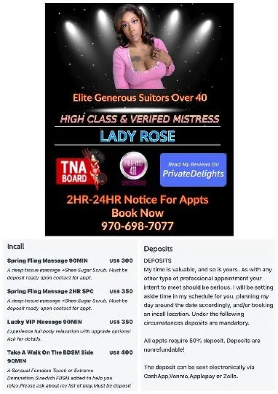 Thanks for taking the time to visit my page Elite Suitors Over 35! My name is Lady Rose and I have curves in all the right places. Exotic Beauty || 5'2 || 170lbs || 34DDD (Natural) We both know why you’re here. With my playful smile, sultry Silhouette and luminous caramel complexion you’ll wonder why you waited until now. *•.*•.*•. .•*.•*.•* *•.*•.*•. .•*.•*.•* *•.*• I planning a trip to visit Cheyenne ,WY for 1 DAY(4/22). Please keep in mind this trip only happens if there pre-bookings appts made and a deposit sent to secure my time and your appointment. If there are no prebookings appts I will not be visiting your city. All sessions required a 2hr notice or 24hrs advance notice. Your safety and comfort are my top priorities. Your intent to meet should be serious. I do not deal with time wasters so yo To ensure a secure and pleasant experience for the both of us,screening and a deposit is required. I don’t respond to any text that doesn’t contain immediate booking info. PLEASE TEXT ME THIS INFO FOR Faster Verification 1.) Your name,age and race 2.) The city you are in 3.) Preferred meeting time & day 4.) Type of Appt/Length of your meeting 5.) Where did you see my post Returning friends I seen before are welcome to call me or text me. Please be deposit ready via cashapp,ApplePay ,Zelle or Venmo when booking me…. *•.*•.*•. .•*.•*.•**•.*•*•.*•.*•. .•*.•*.•* *•.* You always welcome to take a shower, using my fully equipped bathroom before or after your session. My time is very valuable and my schedule will fill up very quickly. I expect that you be a gentleman at all times and respect any boundaries that I have. All time wasters will blocked and will not be able to see me in the future.